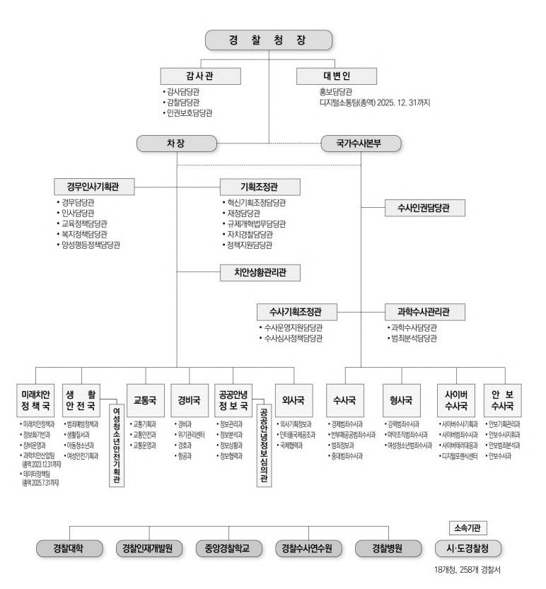 • 8국 체제: 경찰청은 미래치안정책국, 범죄예방대응국, 생활안전교통국 등 8개의 국으로 구성되어 있으며, 각 국은 국민의 안전과 치안을 위한 다양한 임무를 수행합니다. 이 체제는 다양한 분야에서 전문성을 강화하며, 각 국은 독립적이면서도 유기적으로 협력하여 경찰청의 목표를 달성합니다. 예를 들어, 범죄예방대응국은 치안 정책 실행과 예방 활동의 중심에 있으며, 생활안전교통국은 교통 안전과 일상 치안을 보장하는 데 중점을 둡니다.