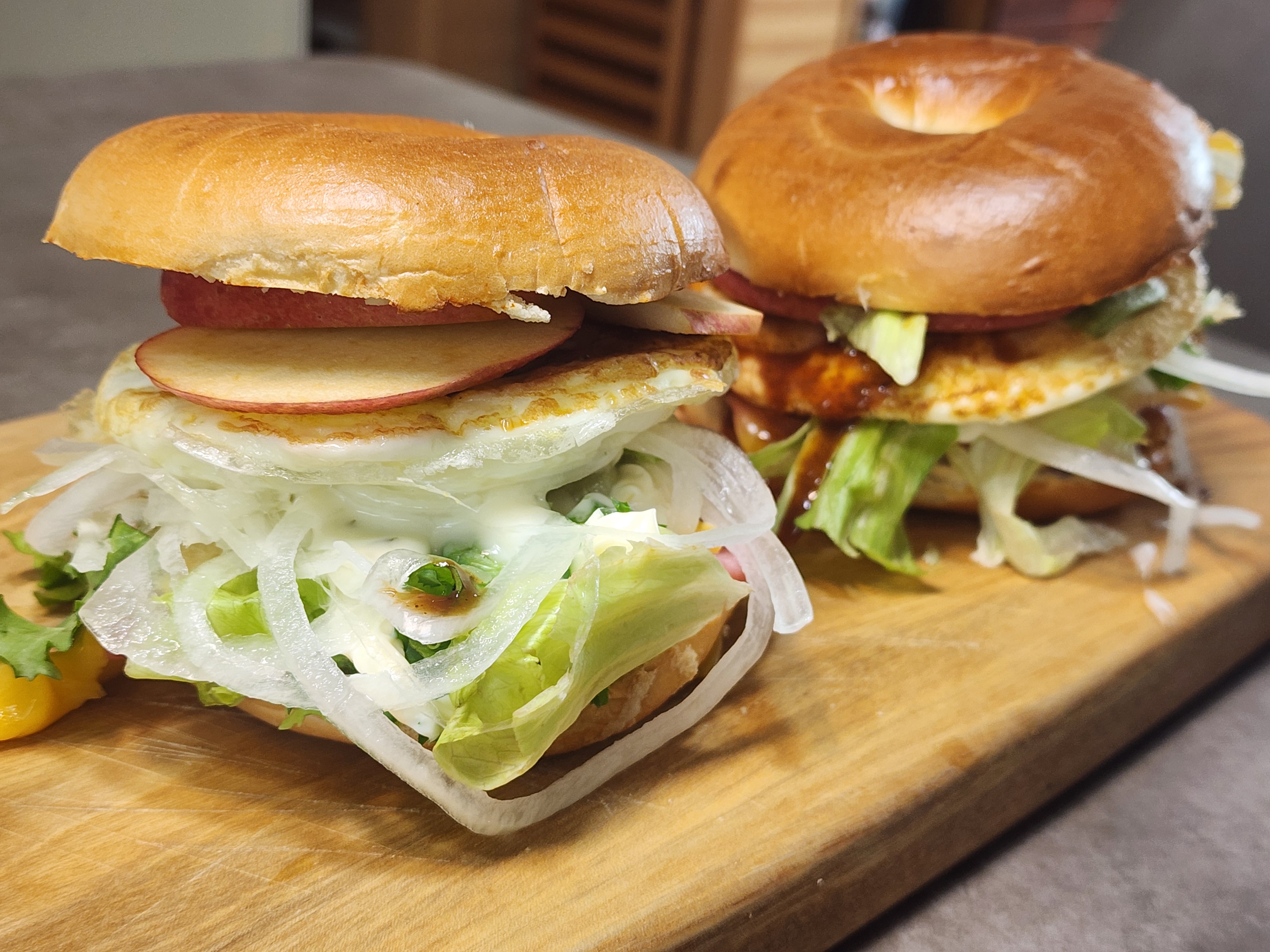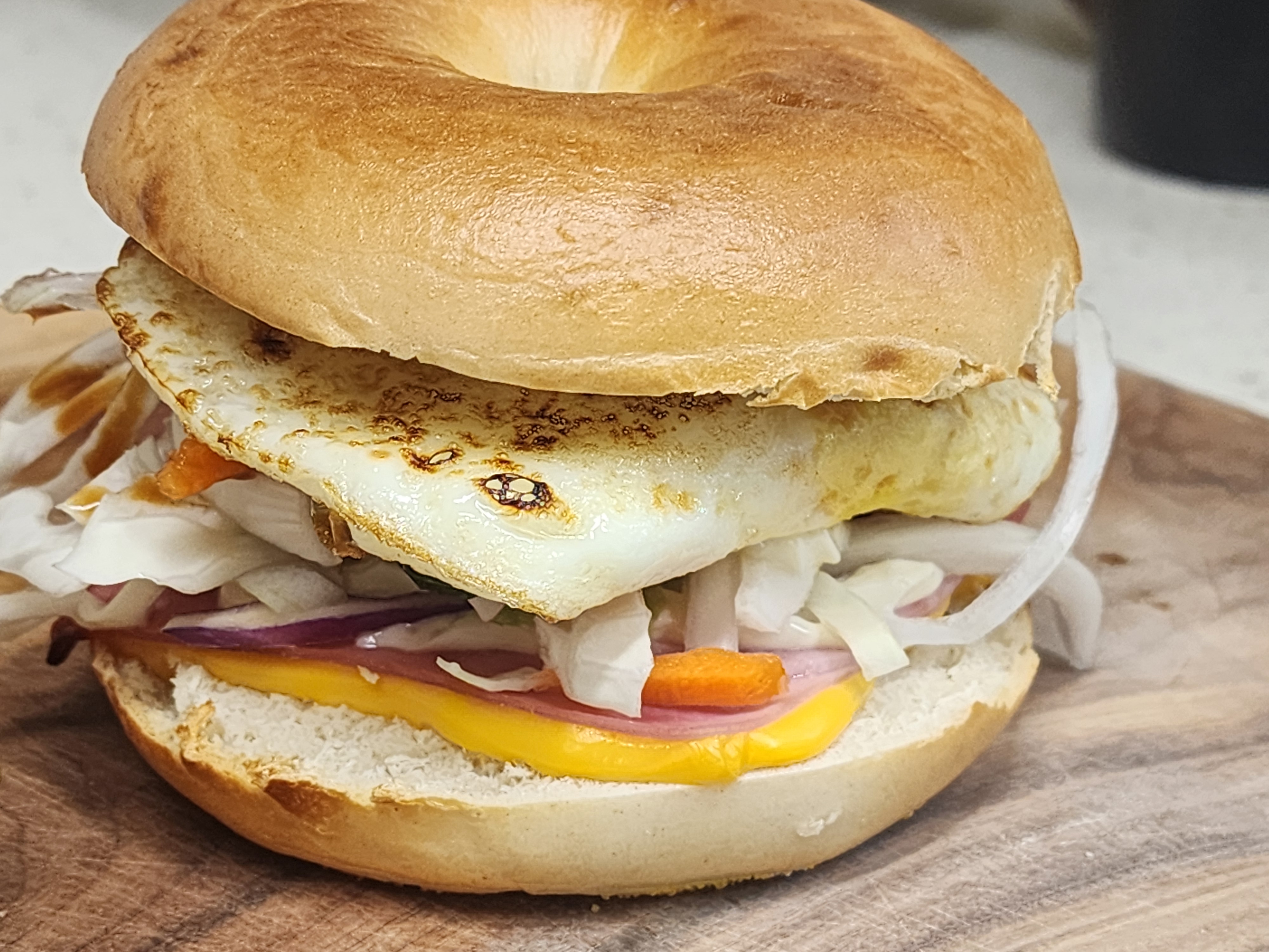 이후 프라이한 계란을 추가합니다. 계란 노른자가 반숙으로 되어 있을 때, 베이글 샌드위치의 속이 촉촉하고 더욱 맛있어집니다. 노른자가 부드럽게 흘러내리면서 샌드위치 전체의 풍미를 더욱 촉촉하게 만들어 줍니다.