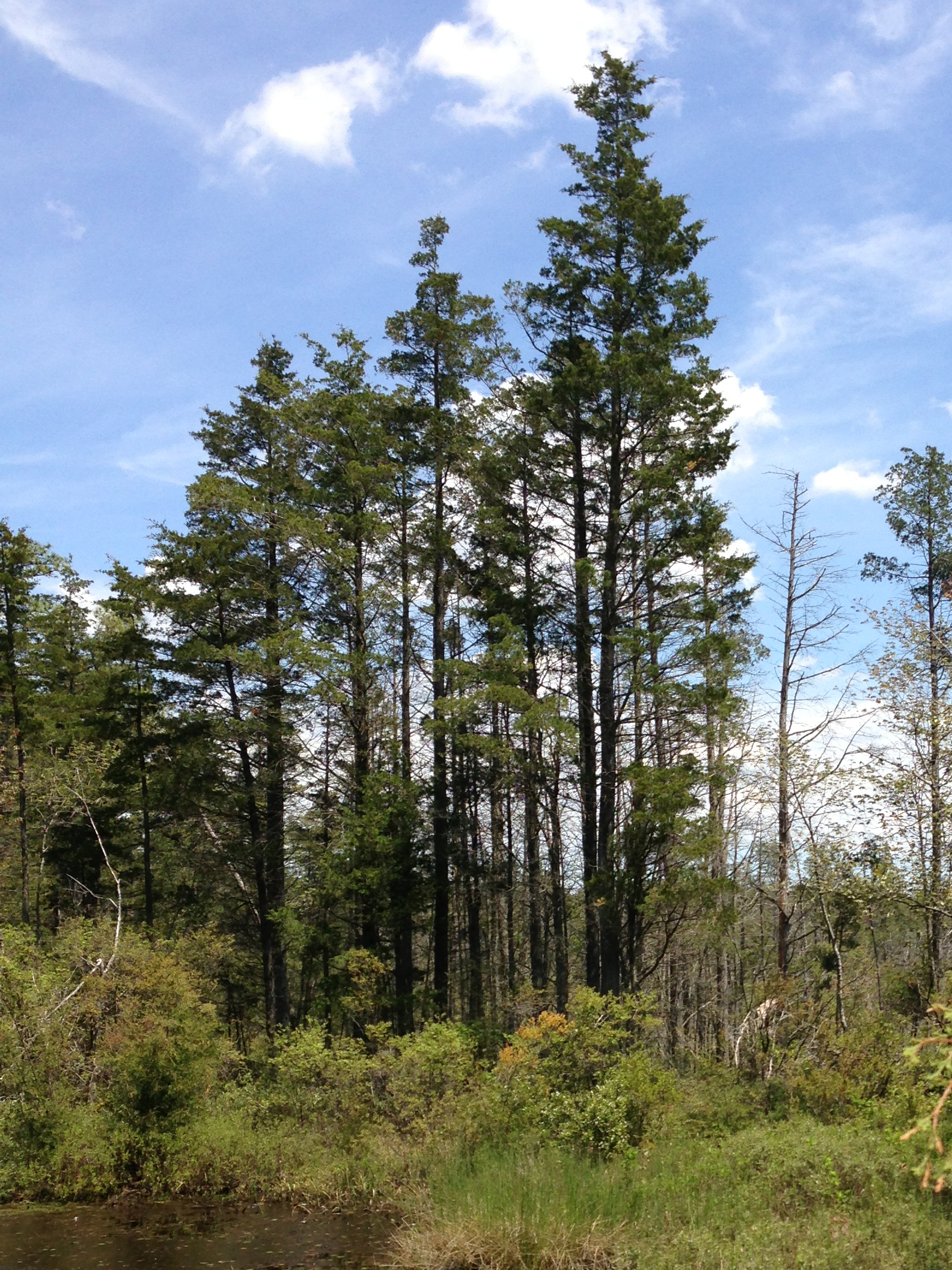 북아메리카에 자생하며, 키가 21~27m까지 자랍니다. 붉은빛 갈색의 목재는 광산용, 울타리 기둥, 지지물로 사용됩니다. 북미의 습지대에서 자라며, 목재의 내수성이 매우 뛰어나기 때문에 해양 환경에서도 유용하게 활용됩니다.