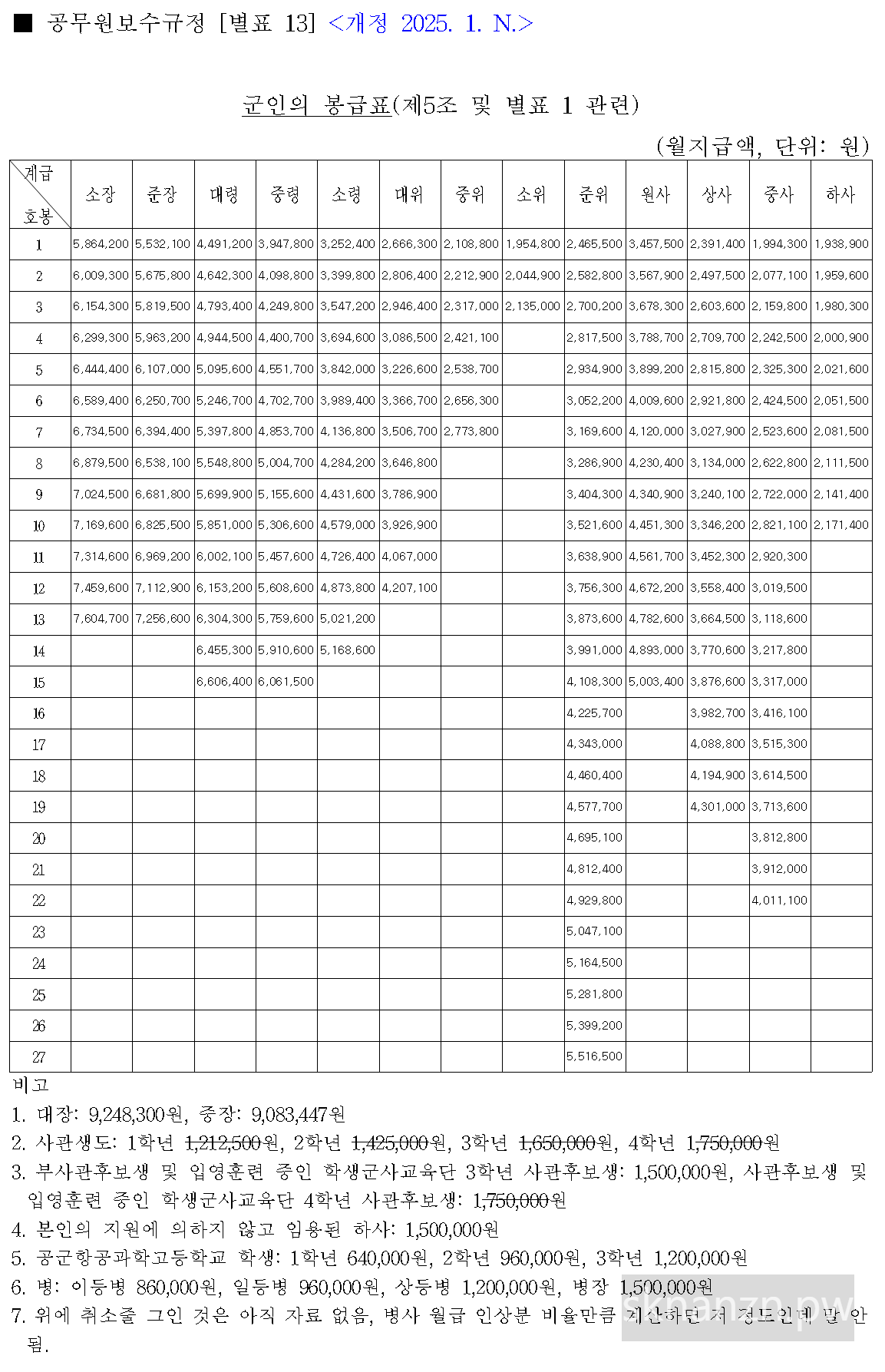 - 병: 이등병 860,000원, 일등병 960,000원, 상등병 1,200,000원, 병장 1,500,000원